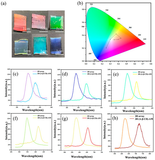(a) Optical photos of 3D O-(A-β-CD)-AM PCs of PMMA with different diameters; (b) CIE of 3D O-(A-β-CD)-AM PCs of PMMA with different diameters; (c–h) the reflection peak of 3D O-(A-β-CD)-AM PCs and PMMA arrays.