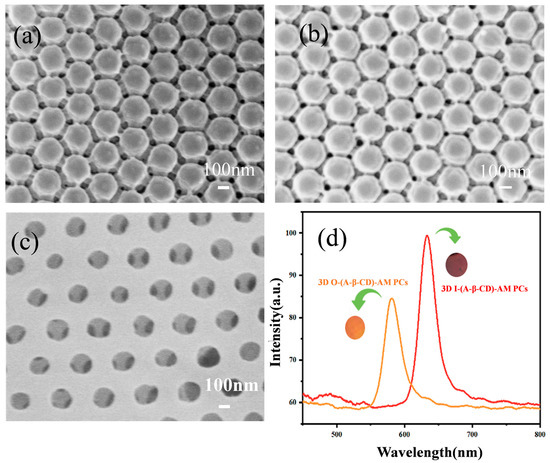 The gap between larger colloidal microsphere arrays is larger, which helps to fill more hydrogels. About 225 nm and 240 nm PMMA arrays were selected for the VOCs sensor. As shown in Figure 4a, the gaps of the 225 nm PMMA array are filled with hydrogel and still have the FCC structure. 3D I-(A-β-CD)-AM PCs were obtained by etching 240 nm PMMA in toluene (Figure 4c). The diameter of the air hole was slightly smaller than the PMMA diameter. The pore structure after etching was uniform and had a large specific surface area. As shown in Figure 4d, the λmax of 3D O-(A-β-CD)-AM PCs was 648 nm, while the λmax of 3D I-(A-β-CD)-AM PCs was 582 nm. At the same time, the structural color changed from dark red to orange. The blue shift of the 3D I-(A-β-CD)-AM PC was caused by the replacement of PMMA with ERI of 1.48 by air with ERI of 1 and the reduction of the pore size of hydrogels. Optical properties of 3D PMMA arrays and 3D (A-β-CD)-AM PCs were determined using Bragg’s law, Equation (1):