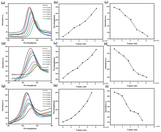 Responses of the 3D O-(A-β-CD)-AM PC to VOC gas. (a) λmax responses of 3D O-(A-β-CD)-AM PC to toluene gas; (b) the relationship between the wavelength of λmax and volume ratio; (c) the relationship between the intensity of λmax and volume ratio of the toluene gas; (d–f) λmax responses of 3D O-(A-β-CD)-AM PC to xylene gas; (g–i) λmax responses of 3D O-(A-β-CD)-AM PC to acetone gas.