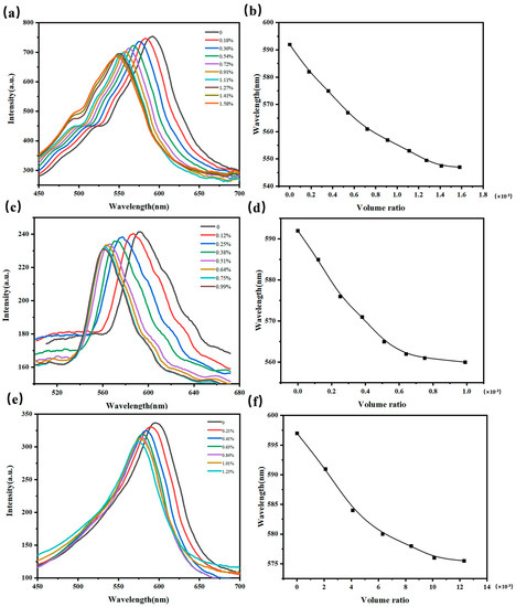 Responses of the 3D I-(A-β-CD)-AM PCs to VOC gas. (a) λmax responses of 3D I-(A-β-CD)-AM PCs to methanol gas; (b) the relationship between the wavelength of λmax and volume ratio; (c,d) λmax responses of 3D I-(A-β-CD)-AM PCs to ethanol gas; (e,f) λmax responses of 3D I-(A-β-CD)-AM PCs to propanol gas.