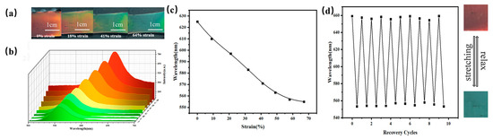 In addition to high selectivity, the sensor also requires a certain tensile property [47,48,49]. The PCs had an outstanding stretching ability and the structural color changed with the different pulling forces. As the strain increased from 0% to 64%, the structural color of 3D O-(A-β-CD)-AM PCs with a diameter of 225 nm PMMA gradually changed from red to blue-green (Figure 8a). As shown in Figure 8b, the λmax was blue-shifted from 659 nm to 553 nm as the pulling force increased. The increase in the spacing of the colloidal microspheres in the horizontal direction was smaller than the decrease in the vertical direction, so the reflection peak was blue-shifted. In addition, as the pulling force increased, the amount of change in the reflection peak decreased gradually (Figure 8c). With the application of the pulling force, the reduction of the distance between the colloidal microspheres in the vertical direction became smaller, so a larger force was applied to achieve the same blue shift in the large pulling force range. To test the practicality of the material, a stretching cycle experiment was carried out. The 3D O-(A-β-CD)-AM PC formed by in-situ polymerization and cross-linking reaction with acrylamide could effectively dissipate energy during ten cycles and maintained the integrity of the gel polymer segment. In the process of cyclic stretching, the 3D O-(A-β-CD)-AM PCs exhibited a structural color change of red-blue green-red, and the corresponding reflectance spectrum is shown in Figure 8d. With the change of strain, the 3D O-(A-β-CD)-AM PC can respond quickly, and the reflection peak changed from 659 nm to 553 nm. Due to the good mechanical properties of the 3D O-(A-β-CD)-AM PC, the reflection peak can be instantly restored to 659 nm after the pulling force is removed.