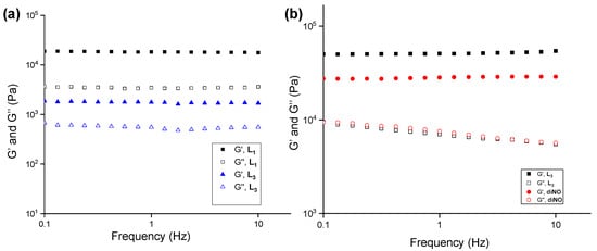 Frequency-sweep experiments performed on (a) L1 and L3 gels at 2.0 wt% and (b) L3 and diNO gels at 4.0 wt% in water at a constant strain of 0.02% at 20.0 °C, respectively.