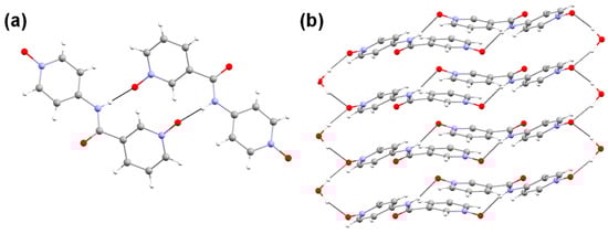 We also analyzed the solid-state structure of the plate-shaped crystals (minor product), which indicated that L3 crystallized in the monoclinic space group (P2/c) with two water molecules (L3•2H2O) (Figure S7 and Table S1). The molecule was planar compared to L3•H2O, but a similar interaction was observed between the amide and N-oxide moieties, resulting in a () (14) hydrogen-bonded dimer [70]. However, the aminopyridine N-oxide moiety displayed a bifurcated hydrogen bond with two water molecules, resulting in two-dimensional porous architecture (Figure S7b), which was further stabilized by various non-bonding interactions (Table S2).