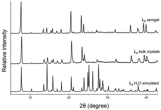 Powder X-ray diffraction is a rapid and powerful tool to obtain an insight into the packing modes of solids. Comparing the PXRD pattern of the bulk material with the simulated pattern acquired from the single-crystal structure enabled us to evaluate the phase purity of the material [63,71]. We have shown that comparing the PXRD pattern of the xerogels with the simulated pattern of the gelator structure could provide information about the key interactions in the gel network architecture [6,12,32,55,72]. This method can be considered as an excellent strategy to correlate the self-assembly process in LMWGs despite the artefacts affecting the drying process [73]. We recorded the PXRD pattern of the L3 crystals obtained via recrystallization from hot water (10.0 mg in 2.0 mL) and L3 xerogel from pure water at 2.0 wt%. The PXRD pattern of the bulk crystals and the xerogel matched with the simulated pattern of the needle-shaped crystals L3•H2O (Figure 4), indicating that the hierarchical assembly of the xerogel network matched with the solid-state structure of L3•H2O. The simulated pattern of L3•2H2O did not match with the PXRD pattern of the bulk crystals and the xerogel, which indicated that the second form did not correspond to the structure of the xerogels (Figure S8).
