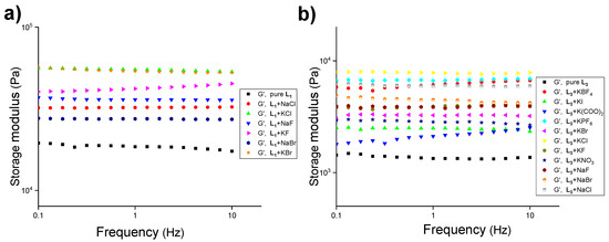 Frequency-sweep experiments of L1 and L3 at 1.5 wt% in water at 20.0 °C in the presence of various salts of sodium and potassium (1.0 equiv.) with a constant strain of 0.02%, (a) L1 (pure ligand at 1.8 wt%), and (b) L3 (pure ligand at 1.8 wt%).