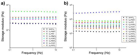 Frequency-sweep experiments with 1.5 wt% of the compound in the presence of various salts of chlorides (1.0 equiv.) in water at 20.0 °C with a constant strain of 0.02%, (a) L1 (pure ligand at 1.8 wt%), and (b) L3 (pure ligand at 1.8 wt%).