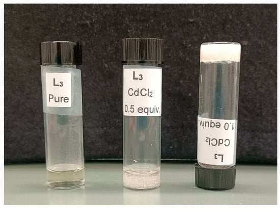 The effect of transition metal salts on the stimuli-responsive property of the hydrogel was studied by adding one equivalent of the metal salt (CuCl2, ZnCl2, or CdCl2) to L1 or L3 at 1.5 wt%. Gels were not obtained for L1 in the presence of these transition metal chlorides. However, L3 gelled at 1.5 wt% in the presence of ZnCl2 and CdCl2 (1.0 equiv.), but no gel was observed with CuCl2. We repeated the experiments by lowering the concentration of L3 (0.7 wt%), and selective gel formation was observed with a 1.0 equivalence of CdCl2, highlighting the specific sensing of cadmium chloride at this concentration (Figure 8). The L3-CdCl2 gelator obtained at 0.7 wt% of L3 and CdCl2 (1.0 equiv.) was stable for several weeks, and the experiments performed at lower concentrations of CdCl2 (0.5 equiv.) resulted in precipitation (Figure 8). We further analyzed the gelation behavior of L3 in the aqueous mixtures (1:1, v/v) of methanol, ethanol, DMF, and DMSO at 2.0 wt/v% in the presence of 1.0 equivalence of ZnCl2 and CdCl2. We observed gelation with ZnCl2 and CdCl2 in the aqueous mixtures of DMF/DMSO, but gels were formed with CdCl2 in MeOH/water and EtOH/water. The gelation ability of INO with ZnCl2 and CdCl2 was previously reported by our group [62]. The isomeric diNO formed a precipitate below 2.5 wt% with 1.0 equivalence of CuCl2 or CdCl2, which highlighted the effective gelation ability of L3 over the isomeric gelator diNO in the presence of transition metals. However, hydrogels were formed at 2.5 wt% (below MGC) with 1.0 equivalence of CuCl2 or CdCl2, and a precipitate was formed in the presence of ZnCl2.