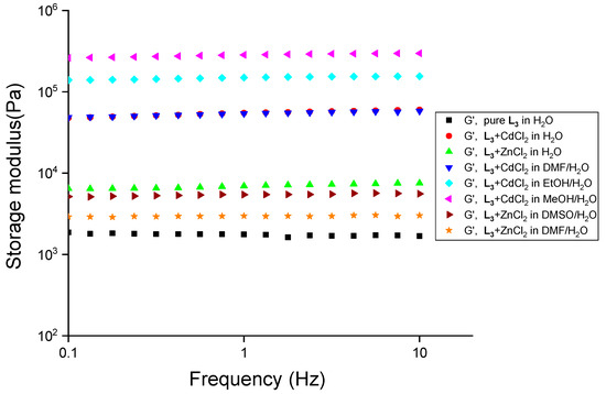 The mechanical strength of the gels with transition metals was analyzed by performing frequency-sweep experiments, and an abrupt increase in the mechanical strength (~24.7 fold) was observed for L3 (1.5 wt%) with CdCl2 (1.0 equiv.). We studied the mechanical strength of the gels at 2.0 wt/v% of L3 with CdCl2 in water and a 1:1 (v/v) aqueous mixture of methanol, ethanol, DMSO, and DMF. A steep increase in the mechanical strength was observed for L3-CdCl2 gels in water (~35.6-fold), methanol/water (~175-fold), ethanol/water (~91.7-fold), and DMF/water (~34.3-fold) with L3 (2.0 wt/v%) (Figure 9).