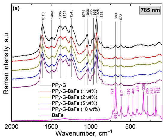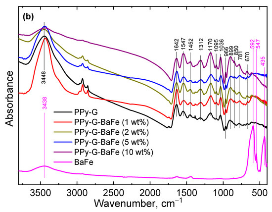 The Raman and FTIR spectra of pristine BaFe, PPy-G aerogel and PPy-G-BaFe aerogels obtained at various BaFe fractions are depicted in Figure 2. In the Raman spectrum of barium ferrite (Figure 2a), two prominent Raman modes at 685 cm−1 (assigned to the motion of the FeO5 bipyramidal group (A1g)) and 336 cm−1 (referred to octahedral (12 k) due to (E2g) symmetry in the BaFe12O19 structure) are well-distinguished [31,32,33,34,35]. The FTIR spectrum of BaFe (Figure 2b) shows mainly three bands: 592, 547 and 435 cm−1, which correspond to the symmetric stretching of (Fe-O) and a broad band at 3438 cm−1 attributed to the vibration of stretching of the O-H bond associated with the adsorbed water [31,32,33].