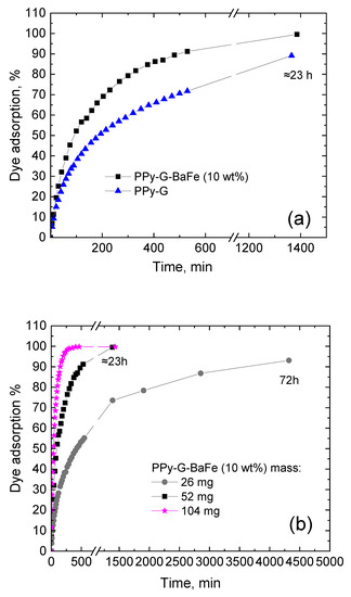 The possibility of application of the prepared PPy-G-BaFe aerogels as adsorbents for water purification was studied using a model anionic dye Reactive Black 5 (UV-vis spectra are provided in Supporting Information, Figure S4). It should be noted that the composites kept their mechanical integrity during the process, and the presence of magnetic particles can facilitate their separation from the treated solution. Figure 4a shows the comparison of adsorption kinetics (52 mg of adsorbent) of PPy-G-BaFe aerogel, prepared at the highest used BaFe fraction (10 wt%), and PPy-G aerogel. PPy-G-BaFe aerogel was found to have a significantly higher adsorption rate and higher adsorption capacity after ≈23 h compared to PPy-G. After ≈23 h, more than 99% of the dye was adsorbed in the presence of PPy-G-BaFe, while in the case of PPy-G, the value of the dye removal fraction was 89% (Figure 5). The difference is likely attributed to the higher specific surface area of the composite containing BaFe nanoparticles. Additionally, adsorption kinetics was studied for 26 and 104 mg of PPy-G-BaFe aerogel, prepared at 10 wt% BaFe fraction (Figure 4b). For the experiment with 26 mg of the adsorbent, 72 h was taken as the equilibrium point.