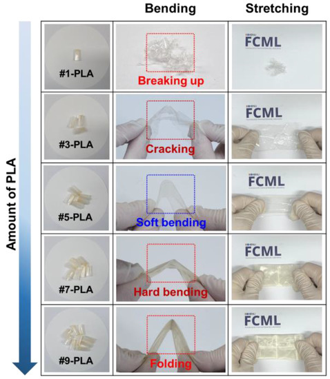 Digital photographs of bending and stretching tests for PLA substrates according to the added number of PLA filters.