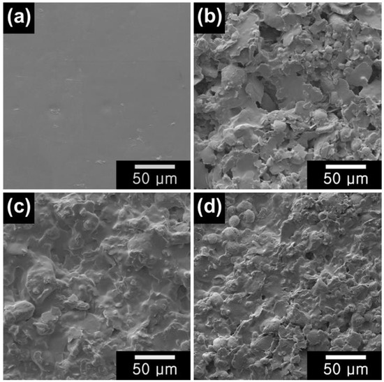 SEM images of (a) PLA substrate, (b) HTW-C/PLA, (c) C-MnO2/PLA, and (d) C-Fe3O4/PLA.