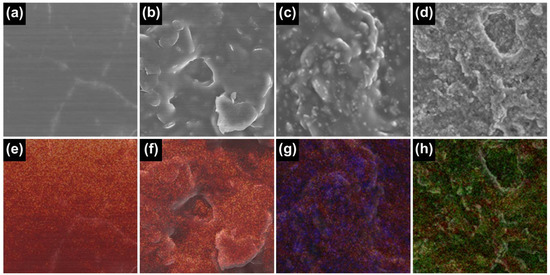 SEM and overlaid elemental mapping images of (a,e) PLA substrate, (b,f) HTW-C/PLA, (c,g) C-MnO2/PLA, and (d,h) C-Fe3O4/PLA, respectively [detected elements: C (red), O (yellow), Mn (blue) and Fe (green)].
