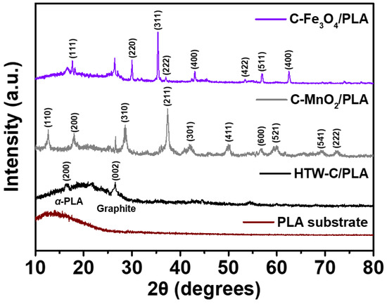 XRD spectra of PLA substrate, HTW-C/PLA, C-MnO2/PLA, and C-Fe3O4/PLA.