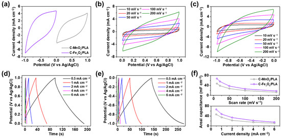 The GCD curves of C-MnO2/PLA and C-Fe3O4/PLA have been obtained to study their electrochemical properties further. Figure 6d shows the GCD curves of C-MnO2/PLA in the potential range of 0–1.0 V at different current densities ranging from 0.5 to 6 mA cm−2. The GCD curves show excellent capacitive behavior without apparent IR drops. The areal capacitances of C-MnO2/PLA calculated from the GCD curves are 46.4, 34.8, 22.5, 11.0, and 5.7 mF cm−2 at current densities of 0.5, 1, 2, 4, and 6 mA cm−2, respectively. Notably, the charging and discharging times are almost balanced. In the case of 1 mA cm−2, the charging and discharging times are 35.0 and 34.7 s, respectively. This result suggests an outstanding coulombic efficiency, indicating excellent capacitive performance and reversibility [73,74,75]. The GCD curves of C-Fe3O4/PLA are measured in the potential range of −1.0–0 V at different current densities, as shown in Figure 6e. The areal capacitances of C-Fe3O4/PLA computed from the GCD curves are 66.7, 47.9, 33.8, 22.0, and 15.4 mF cm−2 at current densities of 0.5, 1, 2, 4, and 6 mA cm−2, respectively. The charging and discharging times at a current density of 1 mA cm−2 are 140.8 and 133.3 s, respectively, implying excellent coulombic efficiency. The evaluated specific capacitances of C-MnO2/PLA and C-Fe3O4/PLA from the CV and GCD curves are shown in the bottom part of Figure 6f.