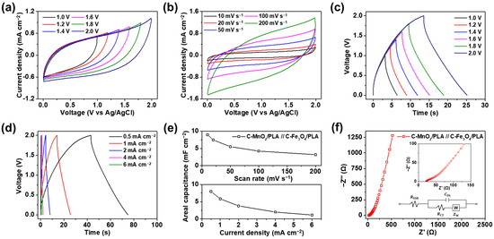Cyclic voltammetry (CV), galvanostatic charge-discharge (GCD), and electrochemical impedance spectroscopy (EIS) measurements were carried out on an electrochemical workstation (ZIVE SP1, WonATech Co., Seoul, Republic of Korea). The CVs and GCDs of the C-MnO2/PLA and C-Fe3O4/PLA electrodes were performed in a traditional three-electrode system consisting of an Ag/AgCl (saturated by 3 M NaCl) assembly and a platinum wire as the reference and counter electrodes, respectively. As an electrolyte, 1 M Na2SO4 aqueous solution was used for the system. The potential range of C-MnO2/PLA and C-Fe3O4/PLA electrodes were set to 0–1.0 V and −1.0–0 V, respectively. The CVs and GCDs were measured by varying the scan rate from 10 to 200 mV s−1 and the current density from 0.5 to 6 mA cm−2, respectively. The current density of the GCD was evaluated by dividing the surface area of the impregnated electrode from the current passing through the electrode [91]. The areal capacitances (mF cm−2) were calculated from the CV and GCD curves using the following equation [92,93]: