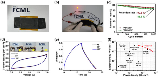 Digital photograph of (a) C-MnO2/PLA//C-Fe3O4/PLA FASC device, and (b) FASC device lightning LED. (c) Long-term cycling test of the FASC device at bending angles of 0 and 90° with the application of current density of 4 mA cm−2. (d) CV and (e) GCD curves of the FASC device at bending angles of 45, 90, and 180°. (f) Ragone plot of the FASC device compared to various flexible supercapacitor devices.