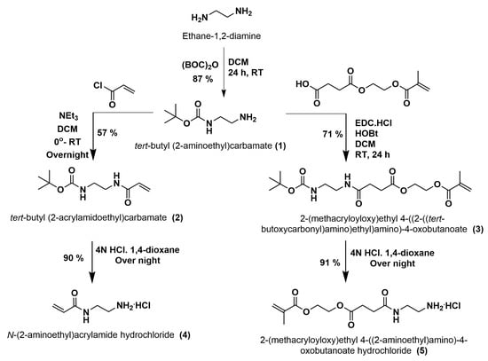 In this research work, we have evaluated the Knoevenagel reaction between different aldehydes and malononitrile (MN) in MFR with polymeric dots, using different amines immobilized as catalysts. Comparative studies of the various amine-based gel dots in the microfluidic systems facilitate the understanding of favorable conditions for the organocatalysis of the Knoevenagel reaction to synthesize different organic entities. In this context, the synthesis of primary-amine-based catalytic monomers, 4 and 5, were completed in three steps as shown in Figure 2. In the first step, ethylenediamine was used as a precursor material for the synthesis of a mono derivative of BOC-protected ethylenediamine, tert-butyl N-(2-aminoethyl)carbamate (1), as an intermediate compound. Furthermore, acrylate derivatives, tert-butyl N-[2-(prop-2-enoylamino)ethyl]carbamate (2) and 2-(methacryloyloxy)ethyl-4-((2-((tert-butoxycarbonyl)amino)ethyl)amino)-4-oxobutanoates (3) were synthesized by the reaction between compound 1 and the acrylate monomers, acryloyl chloride and mono-2-(methacryloyloxy)ethyl succinate, respectively. The obtained acrylate derivative 2 was purified by crystallization from toluene to obtain 2 as colorless crystals. Furthermore, 3 was purified by column chromatography using 10% of ethyl acetate in n-hexane (RF value 0.72) to obtain 3 as a colorless solid. Finally, the deprotection of these acrylate derivatives, 2 and 3, was carried out using 4N HCl in 1,4-dioxane to yield HCl salts of the primary-amine-based catalytic monomers, N-(2-aminoethyl)prop-2-enamide hydrochloride (4) and 2-(methacryloyloxy)ethyl-4-((2-aminoethyl)amino)-4-oxobutanoate hydrochloride (5). The synthesized primary amine 5 had a longer chain length and was more flexible compared to the primary amine, 4. Hence, these two different catalytic monomers showed different physical and chemical properties.