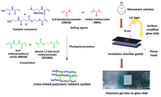 The polymeric networks of various compositions (Table 1) were prepared using photopolymerization using an “Omnicure® S1500” UV-Lamp from Lumen Dynamics, as shown in Figure 3. A monomer solution (15 mmol) containing a catalyst, gel-forming agent (N,N-dimethylacrylamide or methyl methacrylate) and crosslinker (N,N-methelene(bisacrylamide) or ethylenediacrylate) was prepared in DI water (1.7 mL). To the monomer solution, initiator (LPTMBP) (17.5 mg/mL) was added and stirred for 2 h in the dark. Furthermore, the monomer solution (200 µL) was placed in an incubation chamber gasket, and then the monomer solution was covered with a modified microscopic glass slide. Next, the photopolymerization mask (202 dots) was placed on the top of glass slide as a sandwich. The sandwich system was irradiated with various parameters as given in Table 1. After polymerization, the gasket chamber was placed in DI water (200 mL) to wash the polymer gel dots. Furthermore, the gel dots were washed with 2-propanol overnight and then dried at room temperature for 2 days. The neutralization of the gel dots was performed to remove the salts (HCl) in the gel composition. The gel dots were washed for 1 h each with a mixture of methanol/triethylamine (9:1) ratio (100 mL) and tetrahydrofuran/ triethylamine (9:1) ratio (100 mL), followed by pure solvents (tetrahydrofuran and methanol) (100 mL). The purified gel dots were dried at room temperature.