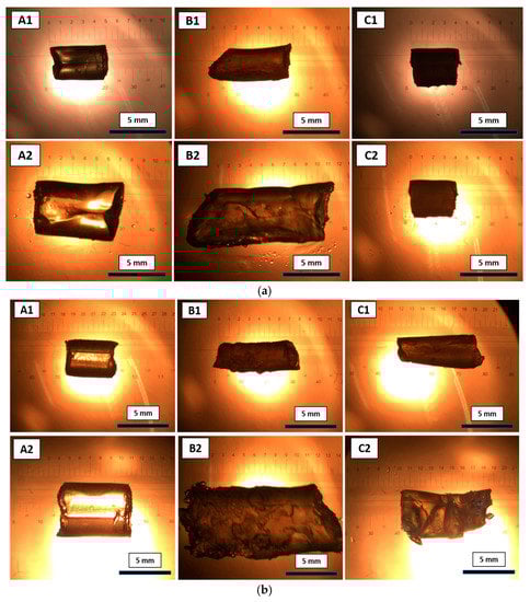 Furthermore, the volume of the cylindrical gels before and after swelling was calculated using Equation (3). The length and width of the gels were recorded using a microscopic ruler, which were shown in the optical images of the gels (Figure 5). The swelling ratio was calculated using Equation (2).