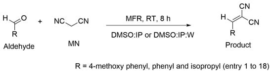 A solution of MN (16 mmol) and 4-nitro benzaldehyde (16 mmol) was prepared separately in 8 mL of the respective solvent mixtures, (DMSO/2-propanol (v:v = 1:1) or DMSO/2-propanol/water (v:v:v = 2:2:1), as mentioned in Table 3. The prepared solutions were placed into a 10 mL of syringe and fixed to the syringe pump, as shown in Figure S1, at a flow rate of 1 µL/min per syringe. The overall flow rate of the MFR with the two reactant solutions was 2 µL/min. The product was collected from the MFR in a vial as eluent at room temperature for 8 h (excluding residence time for 45 min). The collected product was diluted three times with water and the product was extracted with diethyl ether. The organic layer was concentrated using a rotatory evaporator to obtain a yellow -colored solid, 2-(4-methoxybenzylidene) malononitrile.