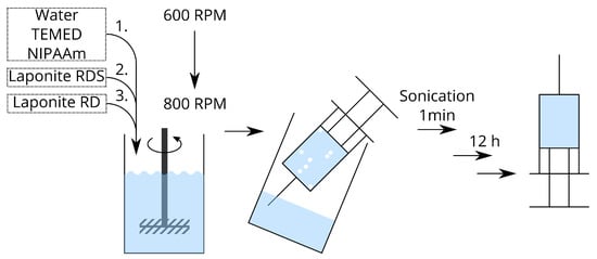 Deionized water () is put into a beaker and stirred at . Tetramethylethylenediamine () and N-isopropylacrylamide () are added. After this is dissolved, Laponit RDS () is added. After this is dissolved, Laponit RD () is added slowly and the solution is stirred at until everything is dissolved. The solution is then picked up into two syringes and sonicated in a Elmasonic P 60 H by Elma for at to gather and remove air bubbles. This pregel-solution is stored for at room temperature before use. The preparation of the pregel-solution is shown in Figure 1.