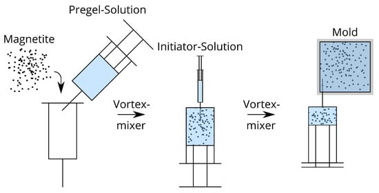 For the synthesis of a hydrogel the pregel-solution () is added to a syringe. Magnetite particles are added according to Table 1. Using a vortex mixer the suspension is homogenized. Afterward, the initatior solution () is added into the syringe. The suspension is again homogenized using a vortex mixer and then injected into a mold with inner dimensions of . After at room temperature, the polymerization reaction is completed. The preparation of a hydrogel is shown in Figure 2.