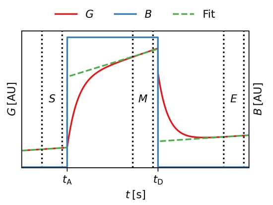 In order to analyze the steady states, only data points in intervals before the activation of the magnetic field, before the deactivation of the magnetic field and at the end of the measurement are used for a fitting procedure. The idealized process is shown in Figure 3.