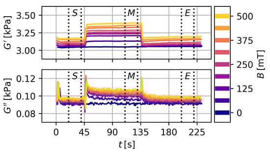 Evaluation of magnetorheological effect under consideration of drift effects using Equation (2) with idealized data. Only data points in the intervals S, M, und E are used for regression analysis.