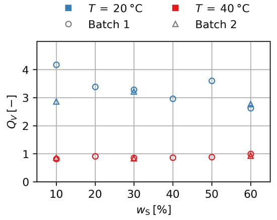 In order to understand the magnetic behavior, first the nonmagnetic behavior of the materials has to be analyzed. Figure 5 shows the degree of swelling over the mass fraction of particles in the initial state . All gels of batches 1 and 2 show a degree of swelling of at and of at . While there is a higher variance for , there is no significant influence of for . The volume increase by swelling leads to a decrease in the particle content, since . While can be used as an identifier for single gels, any scaling of effects will be influenced by the actual particle content , which will be used for further considerations.