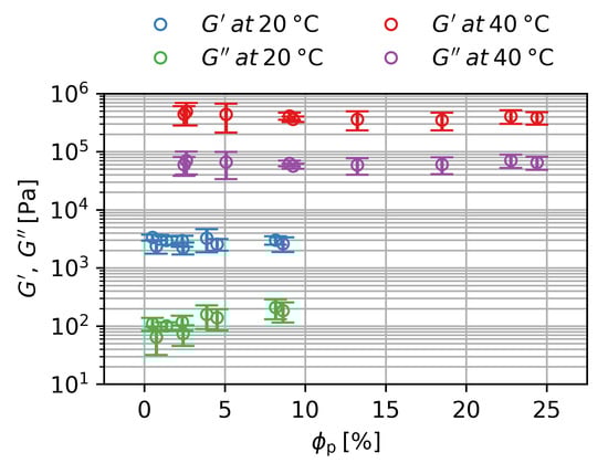 Storage and loss modulus over volume fraction of particles for the first and second batches. Averaged values for three samples per with two standard deviations as statistical error are shown.