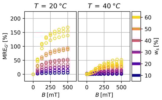 Figure 7 shows the magnetorheological effect of the storage modulus over the magnetic flux density B for gels with different mass fractions of particles in the initial state at and . Roughly summarized, the increases with the magnetic flux density and reaches a saturation at high-flux densities. Additionally, the increases with the particle content and is diminished for the deswollen state. The of the loss modulus behaves qualitatively the same. It has to be noted that the is small compared to the changes exhibited by the gels by deswelling. The maximum observed increases the module by a factor of , while factors over 100 can be observed for deswelling.