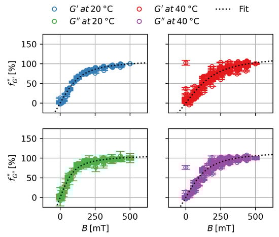 Since no significant influence of on was observed for our samples and saturation of the is reached for high magnetic fields, the influence of on the can be analyzed by using a reference state at either the swollen or deswollen state at . The influence of the magnetic field and the storage modulus results in a constant K, while the influence of the particles is represented by the function :