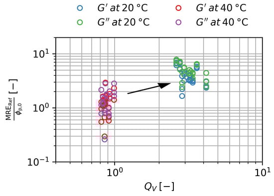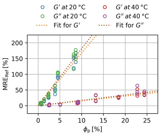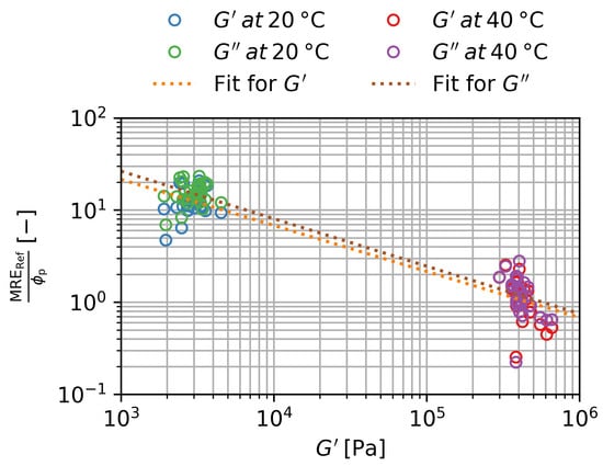 For a single gel an approach using the degree of swelling as a parameter is more useful since for a synthesized gel the particle content and storage modulus are both dependent on . In the case of there is the relationship of , where is the particle concentration in the initial state of synthesis. In the case of a general power-law approach of can be assumed. While the Flory–Rehner theory yields for this approach, theories for polyelectrolyte gels at high salt concentration can yield values of [21]. Using both relationships in Equation (12) we find: