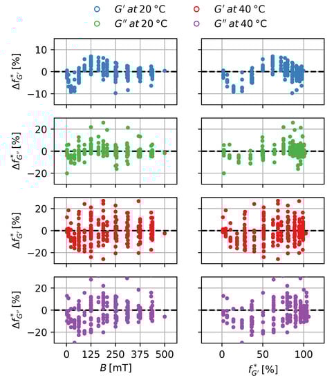 As the Langevin-function is also a non-linear function, again p-values are not well-defined. In this case, we resort to a graphical evaluation of the residuals. These are shown in Figure 12 over the independent value B and the fitted value . For , the residuals are distributed randomly in good approximation in the cases of and . For , especially in the case of , a wave-like pattern does occur. It has to be noted that the residuals of this case are smaller than in the other cases. This pattern indicates that the Langevin-function fails to perfectly model the experimental data for very low magnetic flux densities. However, as shown in the other cases, the Langevin-function still appears to be a good approximation for the scaling behavior of the with B. Additionally, it is a known mathematical function in physics describing the scaling behavior with the magnetic flux density, which supports the use as an approximation.