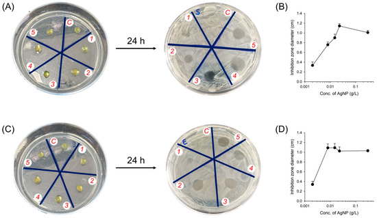 Next, we further confirmed the antibacterial activity of AgNPs with a photocrosslinkable hydrogel, GelMA, which is a frequently used hydrogel platform as a second model hydrogel [31,32,33]. After the bacterial strains on the agar plates were covered, the AgNP-incorporated GelMA hydrogels were put on the plate (Figure 7). The occurrence of an inhibition zone was observed after incubation for 24 h at 37 °C (Figure 7A,C). The hydrogels were completely absorbed into the culture medium and remained in the inhibition area after incubation. The AgNP-incorporated hydrogel successfully produced an inhibition zone despite an extremely low concentration of AgNP (2 mg L−1). The size of the inhibition zone was gradually extended as the concentration of AgNP increased (Figure 7B,D). These results with both hydrogels suggest that bacterial growth was significantly inhibited by the effect of the synthesized AgNPs. The mechanism of antibacterial activities before and after incorporation into the hydrogel can be explained by silver ions and catecholamine groups released from the AgNPs [3,29]. AgNPs can continually release silver ions, which adhere to the cell walls and cytoplasmic membrane. The adhered ions increase the permeability of the membrane and result in the disruption of the bacterial envelope. The uptake of free silver ions into cells then generates reactive oxygen (ROS) species that disrupt the cell membrane and DNA replication due to the interaction of silver ions with the sulfur and phosphorus groups in DNA. Consequently, AgNPs result in damage to DNA replication and cell reproduction and finally cause the termination of bacteria (Figure 4, Figure 6 and Figure 7) [34].