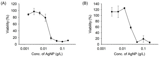 The determination of bacterial inhibition zones was performed using the disc diffusion method [1]. A 100 µL sample with a bacterial solution of 106 CFU mL−1 was spread on an LB agar plate, AgNP-absorbed paper discs were dipped directly in the AgNP solution and were placed on the plate, and the plate was incubated at 37 °C for 24 h. To assess the hydrogels, 100 µL of AgNP-containing hydrogels were placed on the bacterial-covered plates.