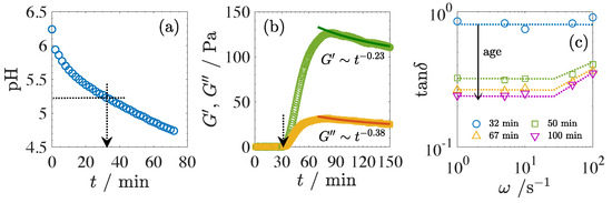 Time evolution of pH value (a), time evolution of the storage and loss moduli measured at = 1 s (b), and tan as a function of (c). Vertical arrows in panels (a,b) indicate the time when pH value reached pH = 5.2, a measure of the initiation of the gelation. Solid curves in panel (b) correspond to power law relations, and . Dotted lines in panel (c) are the guide for eyes. Each symbol corresponds to the data measured at different times, t.