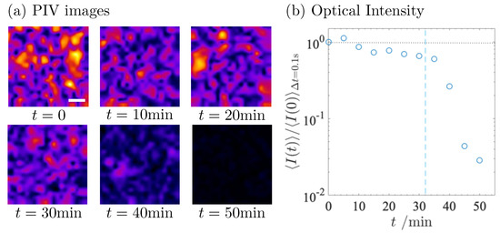 DVA images with a fixed time lag = 0.1 s at different times t are summarised as a sequence with increasing t in Figure 4a, and the optical intensity in the DVA images is plotted as a function of t in Figure 4b. In the DVA images, it can be seen that the trajectories spread homogeneously in the ROI, which proves that all the fat globules diffuse homogeneously. As t = 40 min, it is obvious that the number of trajectories decreases and, finally, the trajectory disappears at t = 50 min. The variation in the trajectories is expressed quantitatively by the optical intensity in Figure 4b. The optical intensity normalized over the initial value at t = 0 is plotted as a function of t. Similar to the PIV data in Figure 2b, the optical intensity decreases abruptly at t = 35 min.