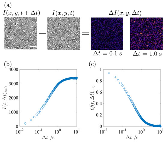 The idea of DVA is to isolate only the contribution of moving objects in the sample solution by taking the differences between images separated by a variable time-lag [22,30]. Figure 3a shows two images separated by a time lag and their different images at two time lags = 0.1 and 1.0 s. In the different images, traces of the migration of the fat globules can be seen as spots during . As increases, the spots become clear. It is obvious from the different images that the displacement of the fat globules develops with .