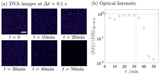 (a) DVA images obtained at fixed time-lag = 0.1 s at various times t. Scale bar corresponds to 10 m. (b) Normalized optical intensity calculated from DVA images at time lag = 0.1 s as a function of t. Vertical dashed line indicates = 32 min.