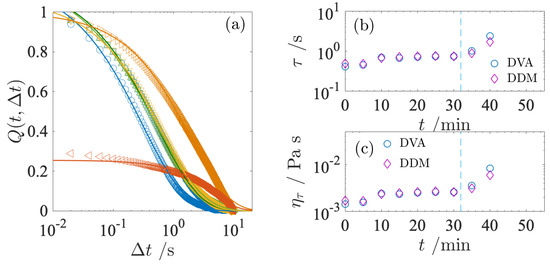 (a) DVA curves calculated at different t. Solid curves are the best fit to Equation (2). In this panel, each symbol corresponds to 0 min (◯), 10 min (□), 20 min (▵), 30 min (▿), 40 min (▹), and 50 min (◃), respectively. Relaxation time obtained from the fitted results is shown in (b). Microscopic viscosity calculated is shown in (c). In the panel (b,c), both data obtained from DVA and DDM are plotted. Vertical dashed line shows = 32 min.