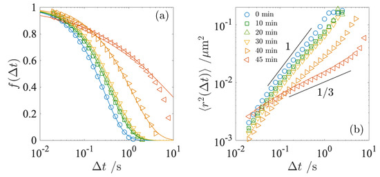 Intermediate scattering function measured at different t (a). Symbols correspond to the data obtained at different t, 0 min (◯), 10 min (□), 20 min (▵), 30 min (▿), 40 min (▹), and 45 min (◃). Solid curves are the best fit to Equation (2). Mean square displacement (MSD) at each t, , is shown in (b). In the panel (b), two lines with slope of 1 and 1/3 are shown as the guide for eyes.