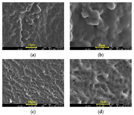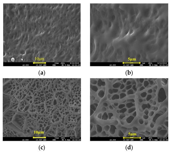 Figure 2a,b revealed that at 1.0% concentration of the cross-linking agent, the product appeared dense with a tight skeleton and long vertical and horizontal network chains, and the product had the characteristics of high strength, toughness, and elasticity. As the concentration of the cross-linking agent continued to increase, the rate of the reaction accelerated, accompanied by release of a large amount of heat. The temperature of the system rose, and the reaction speed was further accelerated, resulting in flash polymerization. The microstructures in