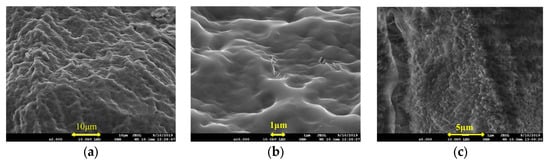 31]. After the expansion of the lithium saponite due to water absorption, the acrylamide monomers entered into the structure and blended themselves during the cross-linking. Due to the interpenetration and blending of the lithium saponite, small protrusions were seen in the shapes of “gully” and “stripe”. This blend showed a multi-dimensional orientation that increased the strength of the IPN.