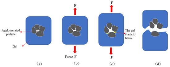 Figure 4c shows that, on increasing the tensile force, the electrostatic and van der Waals forces between the particles of the powdered zeolite aggregates were eliminated, and the cross-linked gel started tearing due to stress concentration.