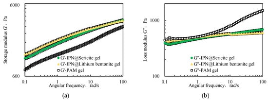 The G’ of the IPN@Particles-gel was higher than the G’ of the conventional PAM-gel. The low-frequency G’ value reflected the cross-linking strength of the elastomer material. The G’ of the IPN@Particles-gel was 1.2–1.7 times that of the PAM-gel based on G’ at an angular frequency of 0.1 rad/s, which reflected a better cross-linking strength.