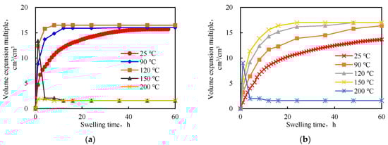Figure 6, it is evident that as the temperature increased, the swelling rate accelerated and the equilibrium water absorption rate increased. This was due to the fact that as the temperature increased, the molecular movements increased, which increased the probability of rapid entry of the water molecules into the interpenetrating network space and the swelling rate was accelerated. With an increase in temperature, the equilibrium swelling ratio of the IPN@sericite-gel increased to a value higher than that of the PAM-gel. The analysis concluded that as the temperature increased, the hydrolysis of the acylamino groups into carboxylic acid groups on the polymerized cross-linked gel increased. Thus, the hydrophilicity of the polymer chain increased, and, consequently, the swelling factor increased. At the same time, with an increase in temperature, the conformational transition energy of the polymer chain of the interpenetrating network polymer increased, the physical entanglements between the molecular chains decreased to a certain extent, the degree of chain relaxation increased, and the water-absorbing expansion of the sample was reduced. This allowed more water to enter the interpenetrating network structure and the expansion multiple increased. The sericite network structure in the IPN@sericite-gel was less affected by temperature; no network relaxation occurred, the temperature rose, the water absorption expansion multiple did not change much, and the increased water absorption expansion multiple was mainly attributed to the hydrolysis of amide groups in the PAM-gel into carboxylic acid groups.