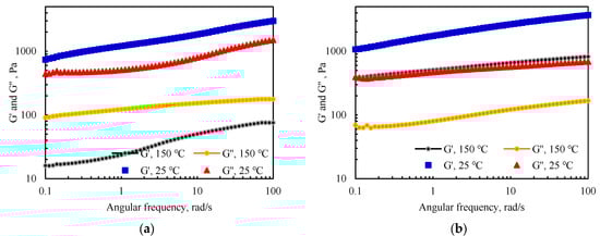Based on the results of the water absorption expansion temperature at different temperatures, the viscoelasticity of the material after water absorption and swelling at 150 °C was tested. The fixed shear modulus was 0.5%, and the testing time was fixed at 10 s with an angular frequency of 0.1–100 rad/s. The experimental results were compared with the viscoelasticity model of the sample after water swelling at 25 °C and the results are presented in