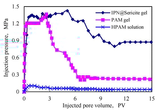 Figure 9 that the injection pressure of the granular plugging agent was significantly higher than that of the HPAM solution, demonstrating its good plugging effect. The maximum pressure reached by using a granular plugging agent was basically the same. The maximum value of the pressure reflected the pressure of the flexible particles for starting the deformation. The transfer of the maximum pressure of the plugging agent prepared using the IPN@sericite-gel was slightly higher, indicating that the force required for the same deformation of the particles was also greater; that is, the strength was greater. The plugging pressure of the plugging agent began to decline after reaching the maximum pressure for some time. This was due to the shear of the particles of the plugging agent during the transfer process that caused the shear and crushing of the plugging agent particles, and then the plugging pressure began to gradually decrease.